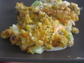 In a separate bowl, mix soup, sour cream, squash, carrots, celery, onion, salt & pepper (to taste).
