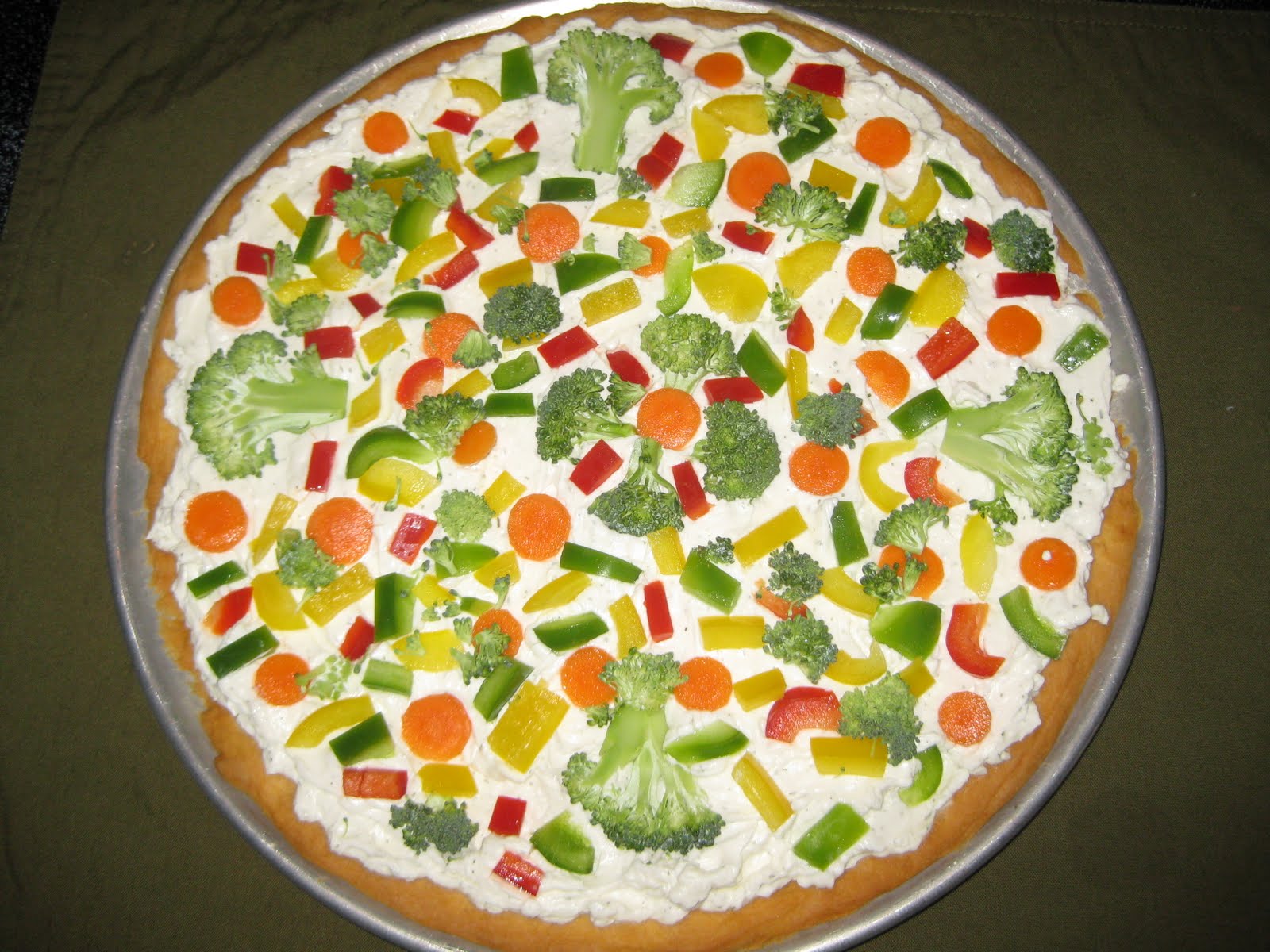 Mix together ingredients through garlic powder. Press crescent rolls onto a cookie sheet or pizza pan. Bake according to package instructions. Let the crust cool. Spread cream cheese mixture onto crust. Add finely chopped veggies to the top. Refrigerate and serve!