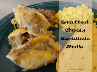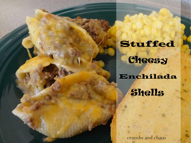 I was first introduced to this recipe when I was a college student. My roommate made them, and I’ve since modified and made a few changes! The best thing about this recipe (besides that it’s delicious) is that you can change it up however you like. If you’re not a fan of refried beans, leave them out! My sister said she could’ve done without them, while my brother said he loved them in there! It’s totally up to you. You could also use red enchilada sauce (which I have done). It just depends on what you like. I served the shells with garlic toast and corn! YUM!