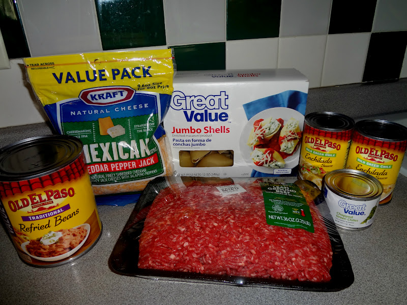 Use a small spoon to fill your shells. I start with a little bit of refried beans, and then finish off with the meat mixture. Place them in your 9” by 13” (it fits about 4 shells across). I had shells and meat leftover, so I just started layering them on top.