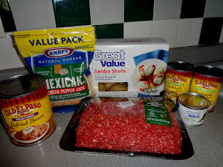 While the ground beef is browning, cook the noodles until al dente (you don’t want them over cooked!). Drain the noodles and rinse in cool water (so you don’t burn yourself when you’re stuffing the shells!)
